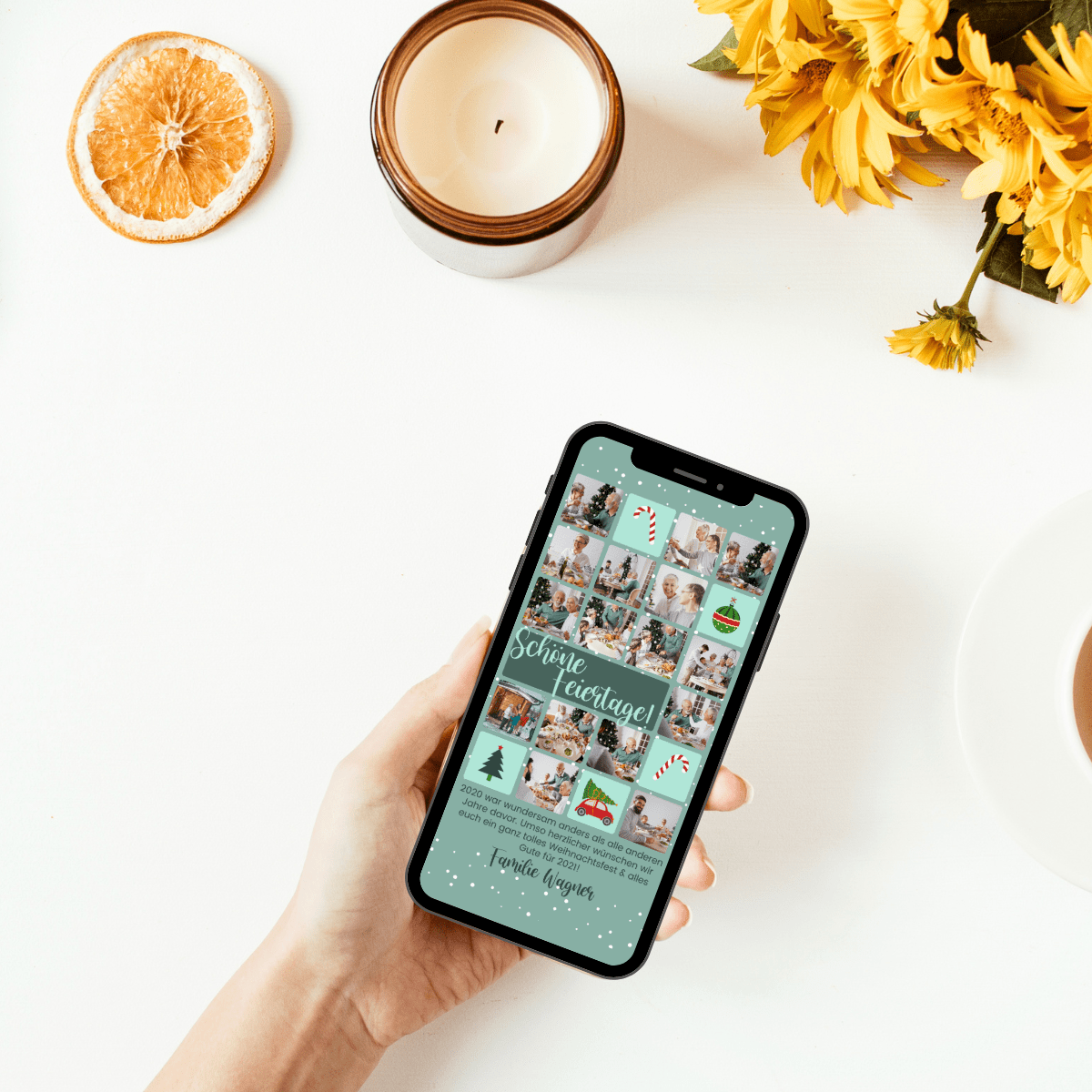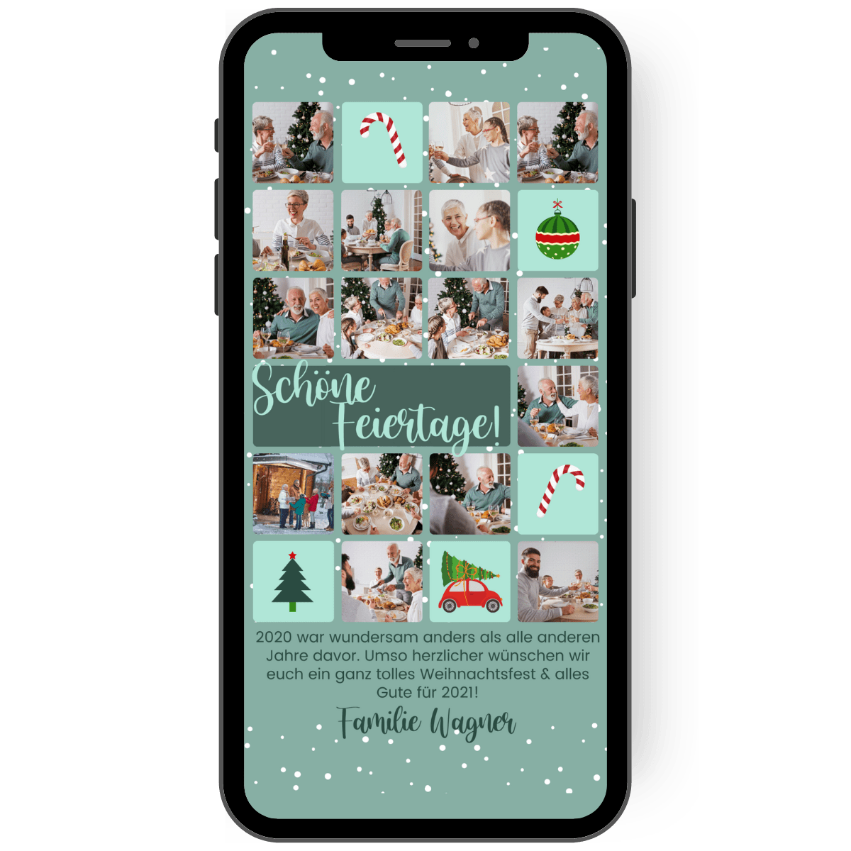 Fotogrüße zu Weihnachten! WOW: Mit bis zu 16 Fotos kannst du mit dieser Kartenvorlage von deinem Jahr erzählen. So zeigt diese tolle Collagen-Karte dein Jahr und versendet die schönsten Weihnachtsgrüße. Wenn du ein zartes Grün liebst und auch weihnachtlichen Symbole, dann ist diese digitale WhatsApp Karte genau richtig, um die schönsten Weihnachtsgrüße im Schneegestöber zu versenden.