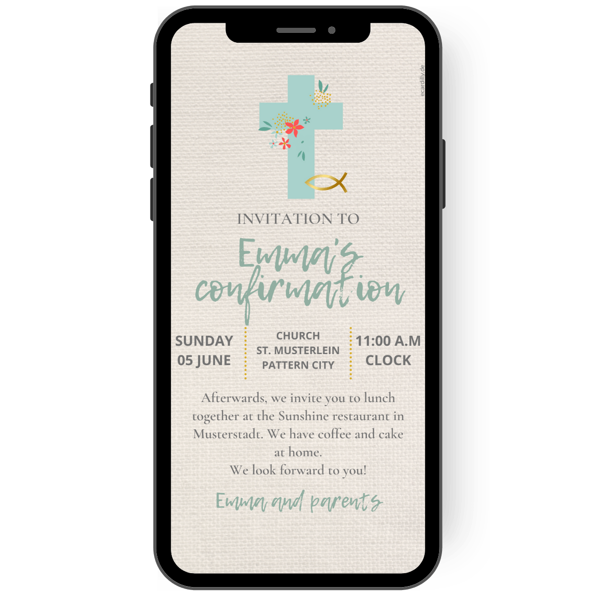 Meine Kommunionskarte ist eine digitale Einladung! Mit dieser schlichten aber dennoch verspielten digitalen Einladungskarte lädst du deine Familie und Freunde schnell und unkompliziert zu deiner Kommunion/Konfirmation oder Firmung ein. Eine eCard mit beigen Hintergrund auf dem ein großes Kreuz in Mintgrün zu sehen ist, das mit Blumen und einem Kirchensymbol - den Fisch - verziert ist.  Einfach deinen persönlichen Text, Datum, Ort und Uhrzeit in die Vorlage eintragen und schon kannst du deine Kommunionseinladung über dein Handy versenden.